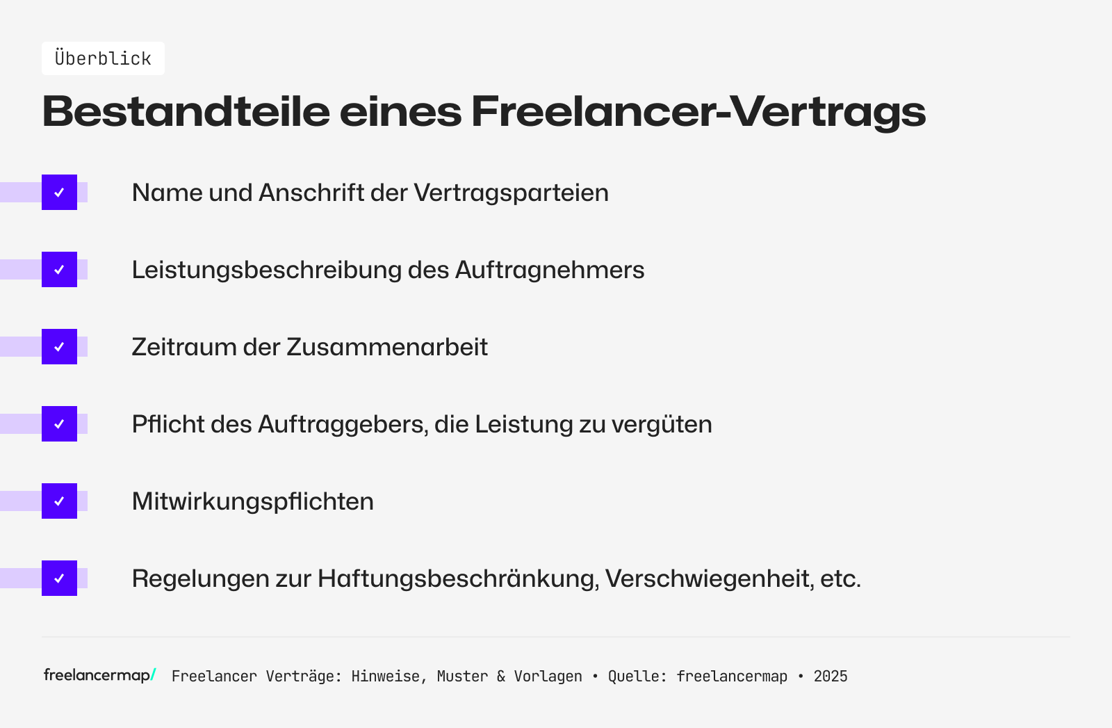Zwingend enthalten sein sollten unter anderem folgende Punkte: Parteien, Leistungsbeschreibung, Zeitraum/Meilensteine, Vergütung, Mitwirkungspflichten, sowie Regelungen zu Haftung, Verschwiegenheit/Datenschutz, Wettbewerb und Referenznennung. Ziel ist ein möglichst eindeutiges, zweifelsfreies Abbild der Zusammenarbeit.