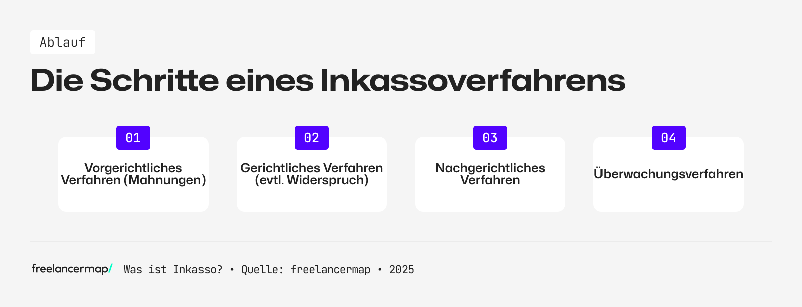 Der Gläubiger führt dann entweder ein eigenes Inkassoverfahren (durch unternehmenseigenes Mahnwesen oder Forderungsmanagement) durch oder beauftragt einen externen Dienstleister. Das Inkassoverfahren kann aus vier Phasen bestehen: