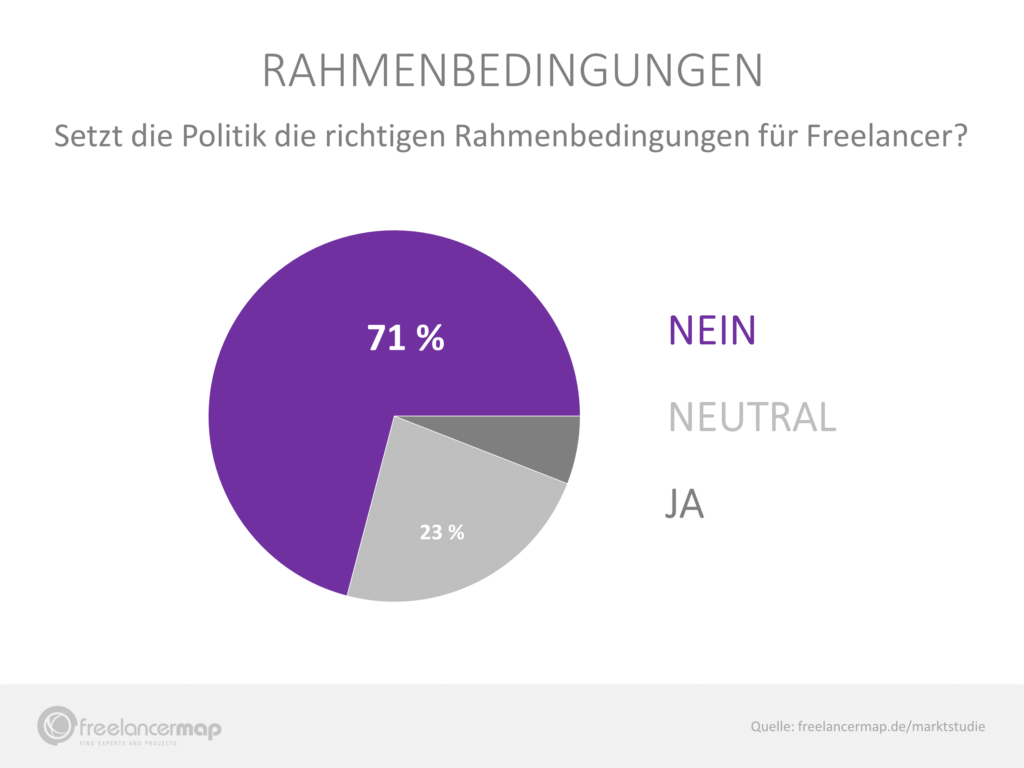 Die Auswertungen des diesjährigen Freelancer-Kompass zeigen, dass etwa sieben von zehn Freelancern Nachholbedarf in der Politik sehen. Mehr als die Hälfte (56%) verlangt die Abschaffung der Scheinselbstständigkeit und eine Vereinfachung des bürokratischen Aufwandes für Solo-Selbstständige.