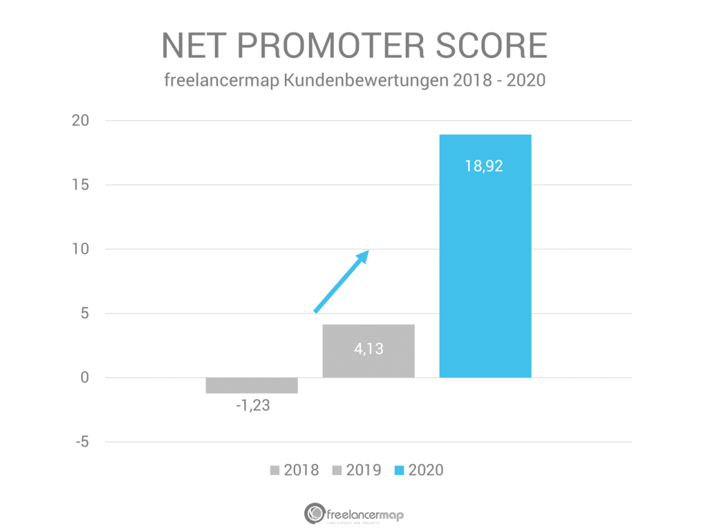Nicht nur das schriftliche Feedback zeigt, dass der Kunde bei freelancermap sprichwörtlich „König“ ist, auch die Daten zeigen eine großartige Entwicklung: Der Net Promoter Score hat sich, im Vergleich zum Vorjahr, deutlich verändert. Die Kennzahl, mittels welcher die Kundenzufriedenheit und -loyalität gemessen wird, ist um etwa 15 Punkte angestiegen. Folglich empfinden viele freelancermap-Kunden empfinden die Projektplattform als empfehlenswert.