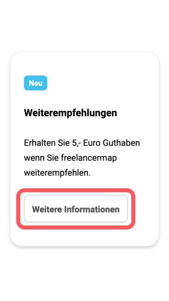 Sind Sie Freelancer mit einem Basis- oder Premium-Account bei freelancermap? Dann finden Sie Ihren Weiterempfehlungslink in Ihrem Profildashboard.