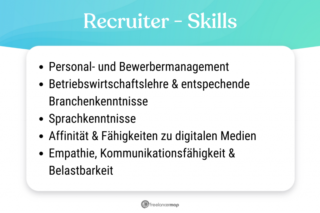 Recruiter müssen sich im Personalmanagement und Bewerbermanagement bestens auskennen. Sie sollten ökonomisch und pragmatisch denken. Erforderlich sind außerdem Grundkenntnisse in Betriebswirtschaftslehre und Organisationslehre. Recruiter sollten über ein fachliches Verständnis in der jeweiligen Branche verfügen, um die Zielgruppe exakt einschätzen zu können. Sie müssen stets mit dem Employer Branding des Arbeitgebers vertraut sein. Modernes Recruiting setzt darüber hinaus eine starke Affinität zu den digitalen Medien und entsprechende Fähigkeiten voraus. Sehr gute Sprachkompetenzen werden gebraucht, um die Stellenanzeigen zu formulieren.
