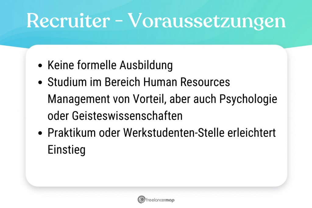 Die Ausbildung ist nicht formalisiert. Ein Studium im Bereich Human Resources Management stellt eine gute Vorbereitung dar. Auch Absolventen der Psychologie, Geisteswissenschaften (z. B. Germanistik), Wirtschaftswissenschaften und Sozialwissenschaften können im Recruiting Karriere machen. Ein Praktikum oder eine Werkstudentenstelle im Bereich Human Resources erweist sich oft als Türöffner.