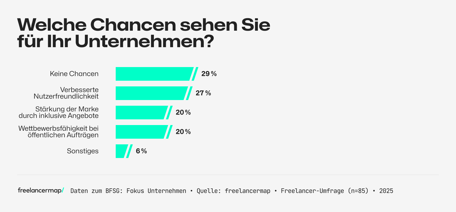 - Chancen für Unternehmen: 29 Prozent der Unternehmen sehen durch das BFSG keine Chancen. Gleichzeitig erkennen 27 Prozent eine verbesserte Nutzerfreundlichkeit, während je 20 Prozent in der Stärkung der Marke durch inklusive Angebote oder in einer höheren Wettbewerbsfähigkeit bei öffentlichen Aufträgen Potenzial sehen.