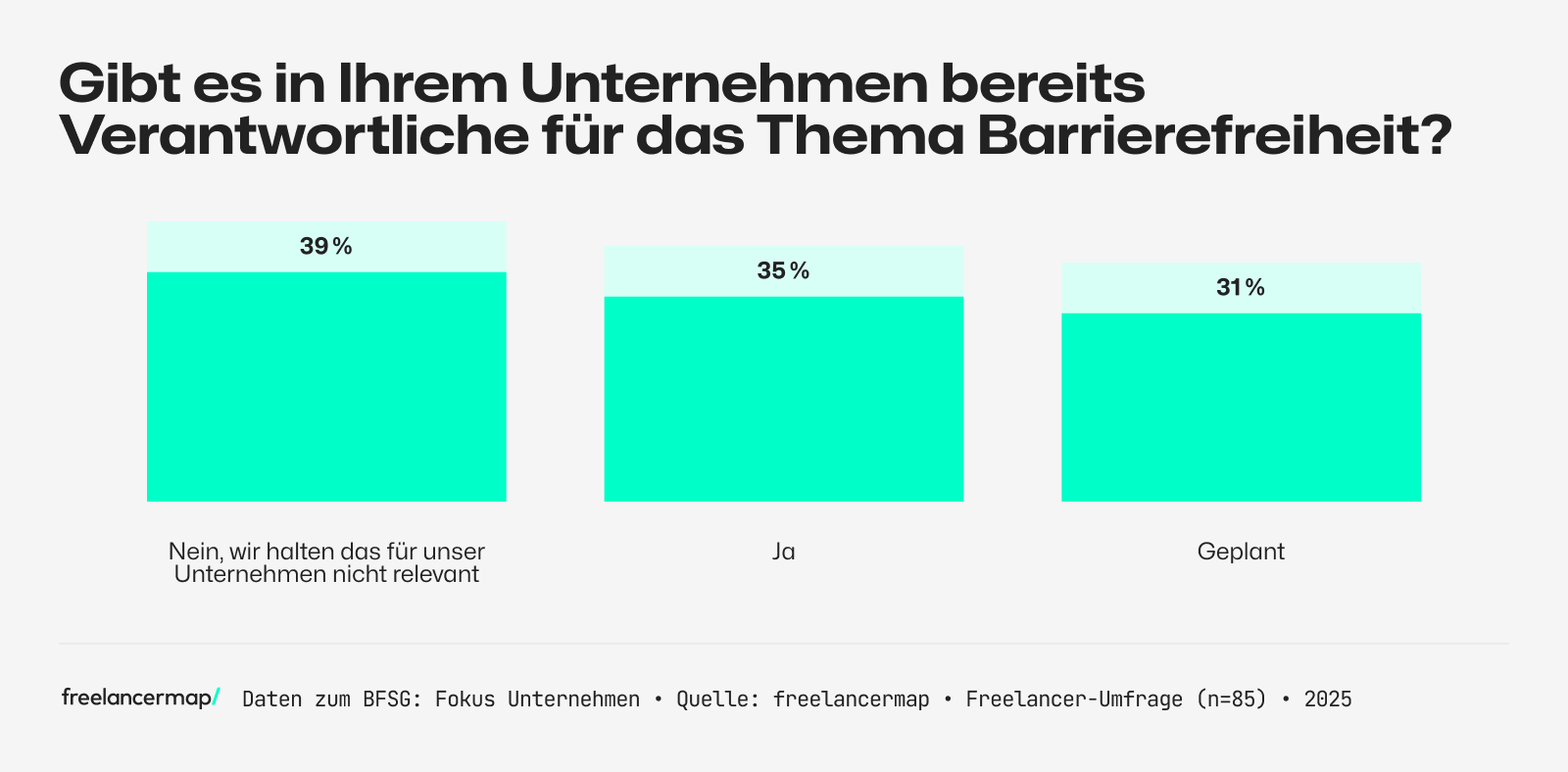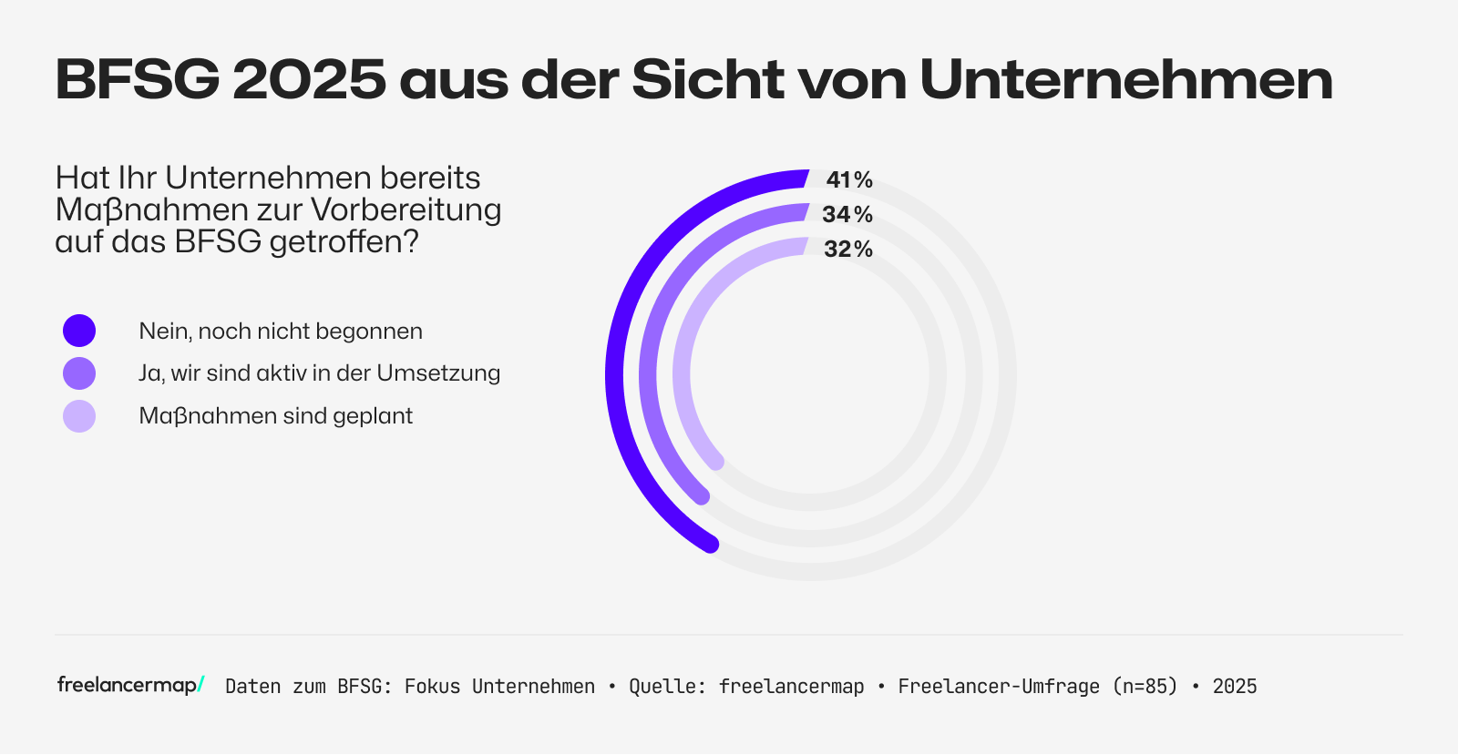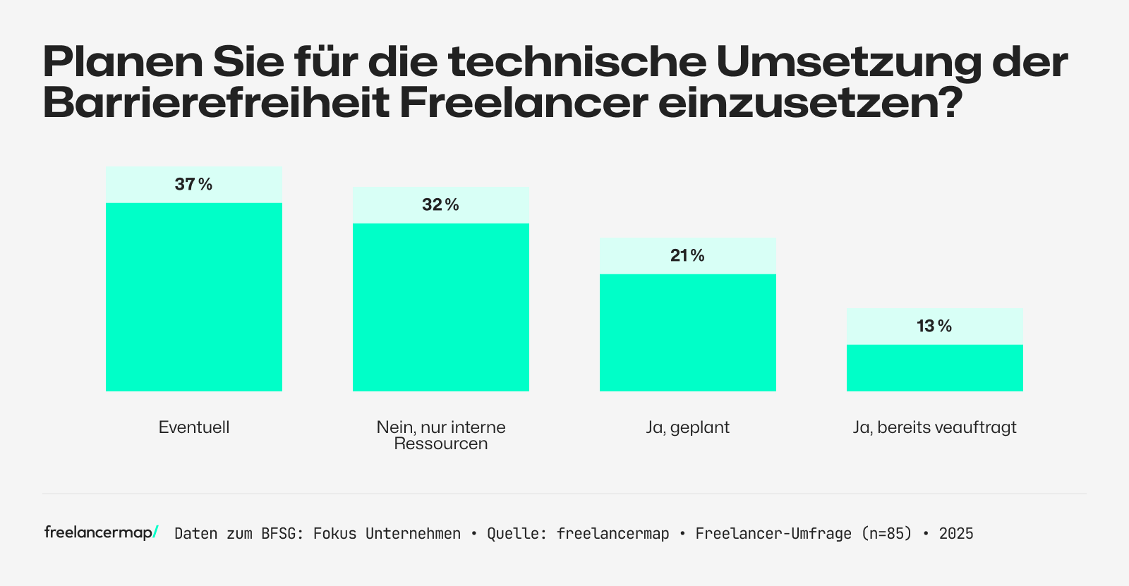 - Maßnahmen zur Vorbereitung: 41 Prozent der Unternehmen haben mit den Vorbereitungen auf das BFSG noch nicht begonnen. Nur 34 Prozent befinden sich bereits in der Umsetzung. Dabei können sich 37 Prozent der Unternehmen vorstellen, Freelancer für die technische Umsetzung der Barrierefreiheit einzusetzen.