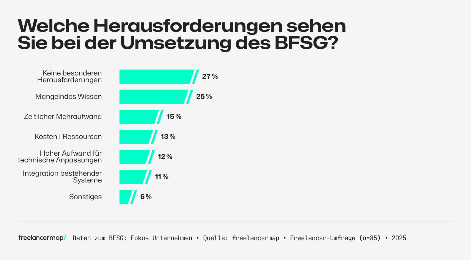 - Herausforderungen bei der Umsetzung: 27 Prozent der Unternehmen sehen bei der Umsetzung des BFSG keine besonderen Herausforderungen. Ein Viertel nennt jedoch mangelndes Wissen als größte Hürde. Weitere Barrieren sind zeitlicher Mehraufwand (15 Prozent), begrenzte Ressourcen (13 Prozent) und technischer Anpassungsbedarf (12 Prozent).