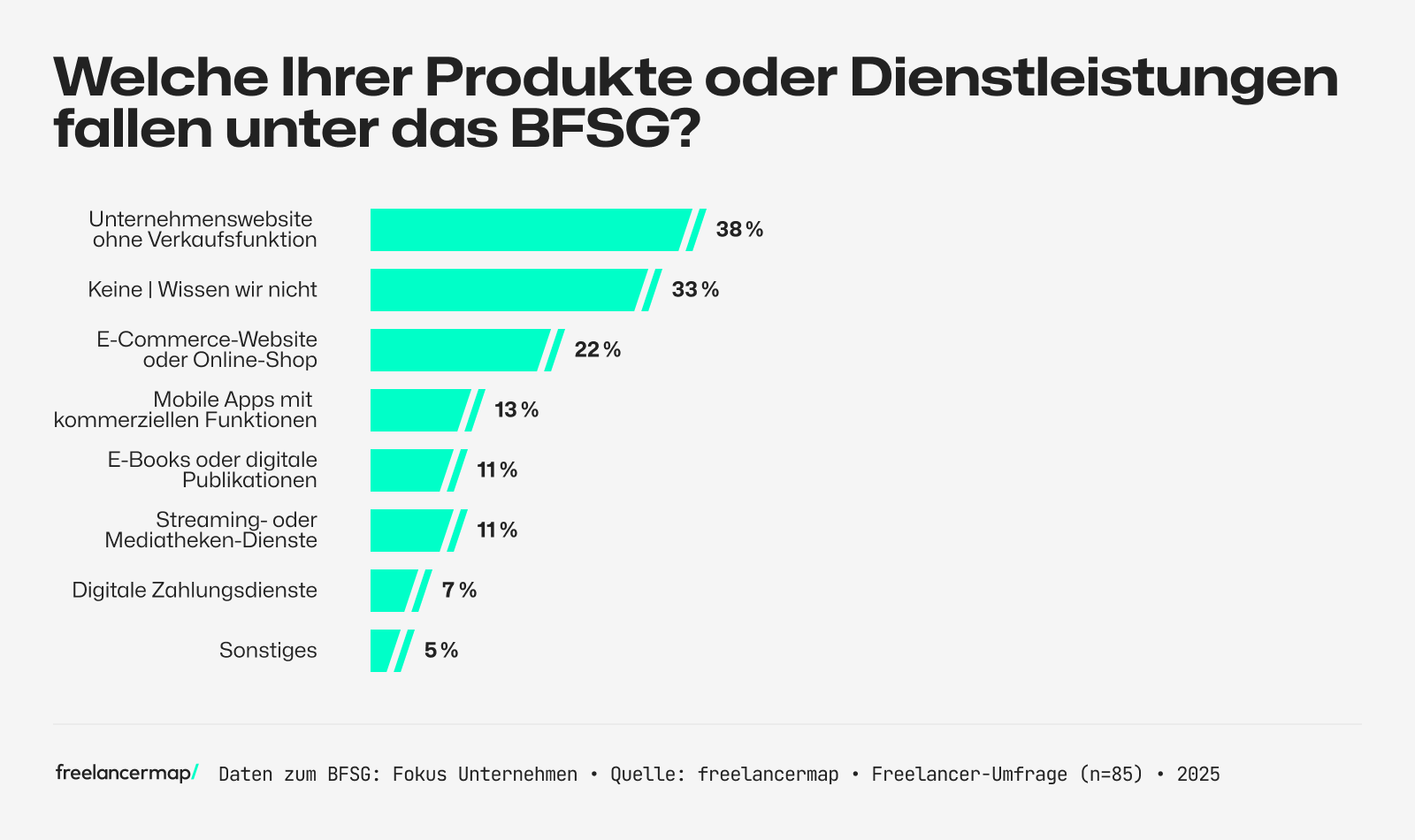 - Betroffene Produkte und Dienstleistungen: Die drei Hauptprodukte bzw. Dienstleistungen, in denen Unternehmen durch das BFSG Veränderungen erwarten, sind ihre Unternehmenswebsite (38 Prozent), E-Commerce-Shops (22 Prozent) und mobile Apps (13 Prozent).
