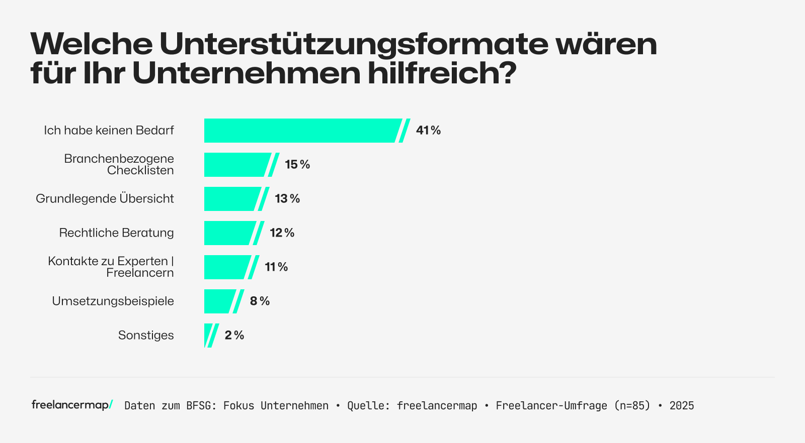 - Unterstützungsformate: 41 Prozent der Unternehmen geben an, keinen Unterstützungsbedarf beim BFSG zu haben. Von den übrigen wünschen sich 15 Prozent branchenspezifische Checklisten, 13 Prozent eine grundlegende Übersicht und 12 Prozent rechtliche Beratung.