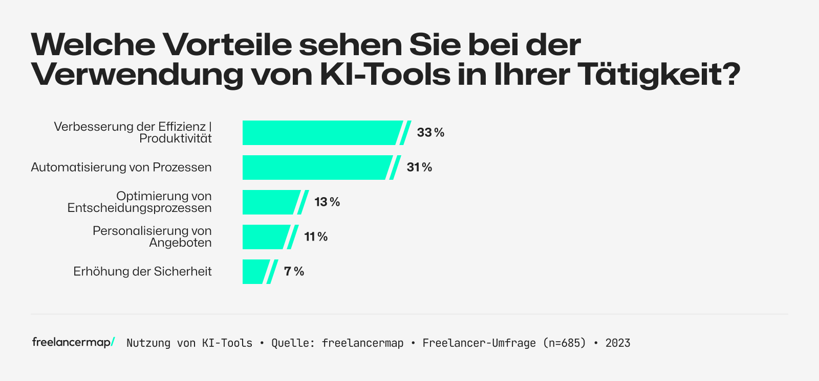 - Vorteile von KI-Tools: Unter den 685 befragten Freelancern sehen 33 Prozent den größten Vorteil von KI-Tools in einer verbesserten Effizienz und Produktivität. 31 Prozent nennen die Automatisierung von Prozessen, 13 Prozent die Optimierung von Entscheidungsprozessen.