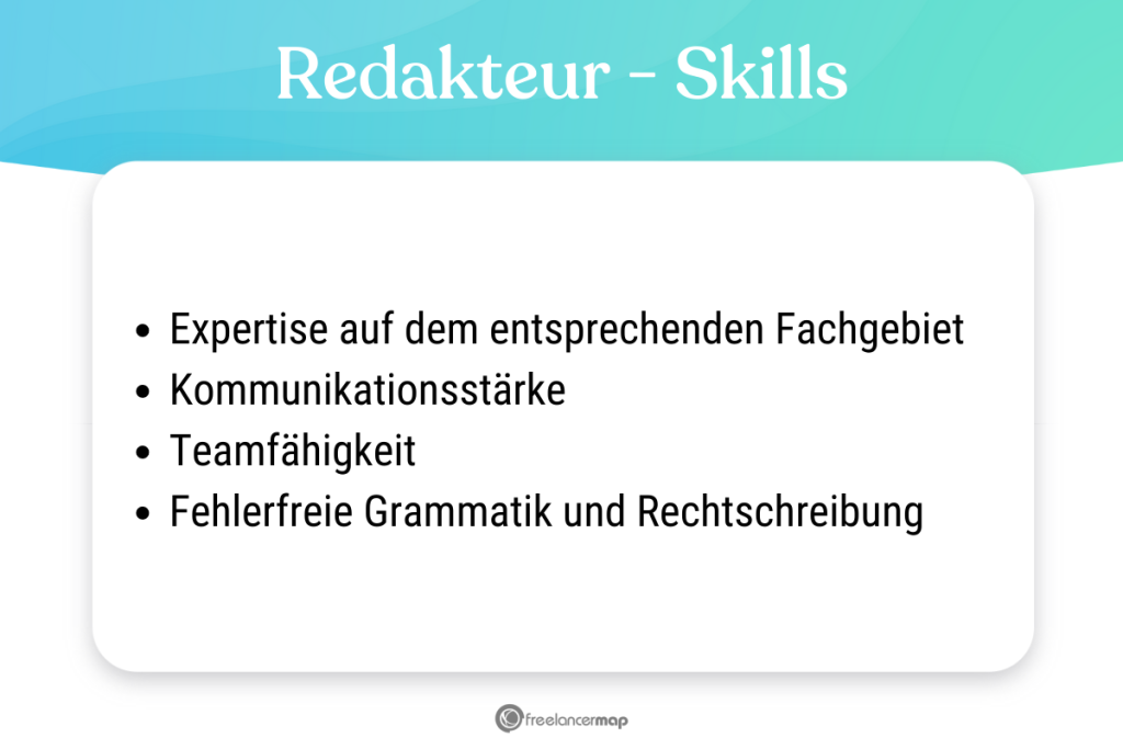 Wichtige Hard Skills für einen Redakteur sind ein sicherer Umgang mit seinen Werkzeugen, wie beispielsweise Texteditoren, Fotokameras, Audio-Equipment, Videoausrüstung oder spezielle Software. Zudem verfügen Fachredakteure über nennenswerte Expertise auf ihrem jeweiligen Gebiet. Wirtschaftsredakteure haben häufig ein entsprechendes Fachstudium durchlaufen. Zu den erforderlichen Soft Skills gehören Kommunikationsstärke, Belastbarkeit und Teamfähigkeit.